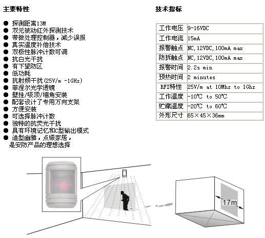 HC-9308雙元紅外幕簾式被動(dòng)移動(dòng)探測(cè)器。專門設(shè)計(jì)的最適用于家庭使用的探測(cè)器。具有信號(hào)捕捉能力強(qiáng),誤報(bào)、漏報(bào)率低,低功耗和真實(shí)溫度補(bǔ)償?shù)奶攸c(diǎn)。產(chǎn)品技術(shù)含量高、制作工藝考究、外觀造型高雅,而且性能穩(wěn)定,使用壽命期長(zhǎng)。特殊的透鏡設(shè)計(jì),無下視死角,既可墻掛式也可吸頂式安裝。配合RA93安裝支架會(huì)更加方便地施工和安裝
